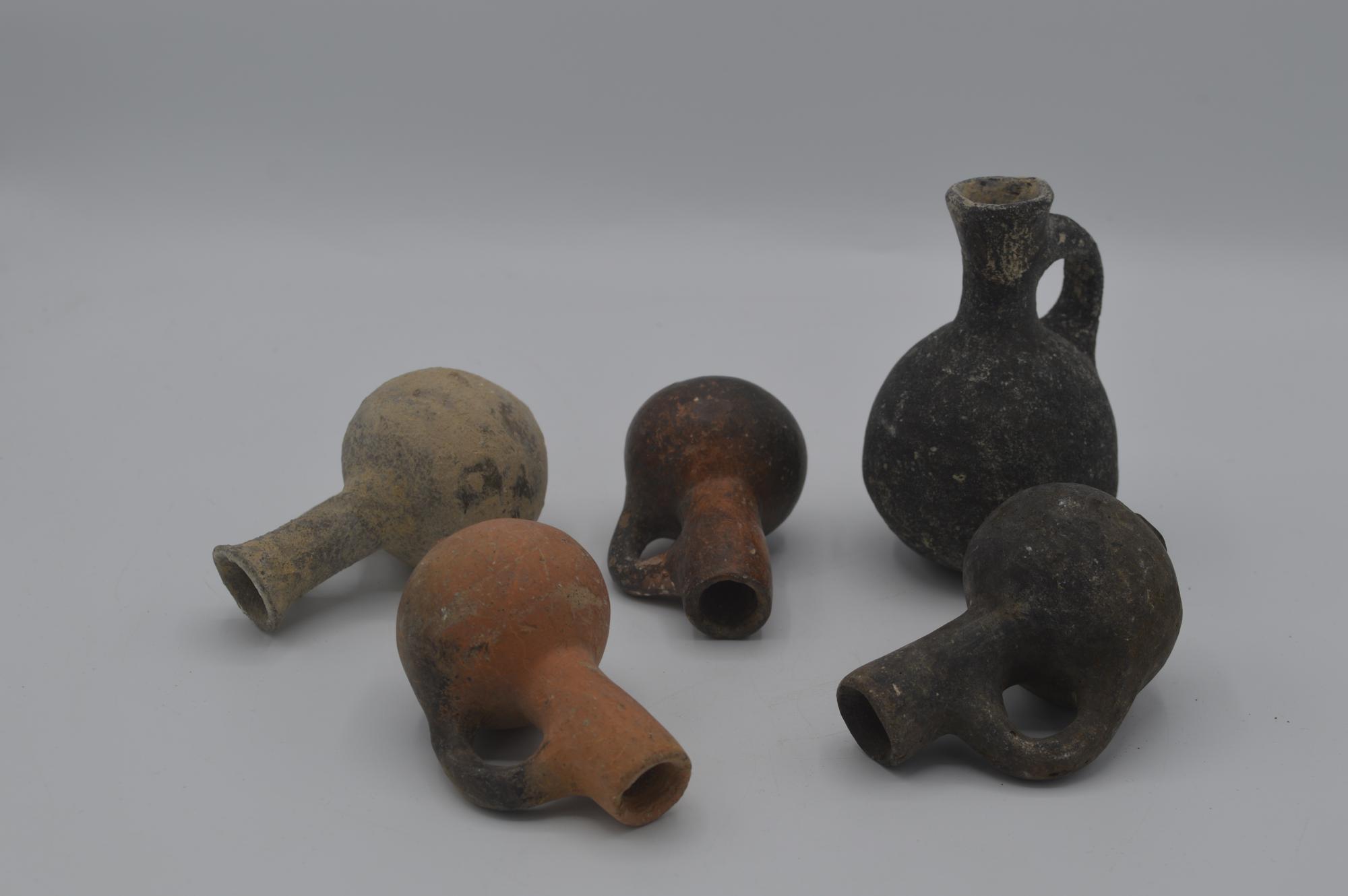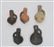 Brocchette con orlo rettilineo e bocca circolare, breve collo cilindrico, corpo piriforme, fondo piatto; ansa a bastoncello impostata dall'orlo alla spalla. (5)
