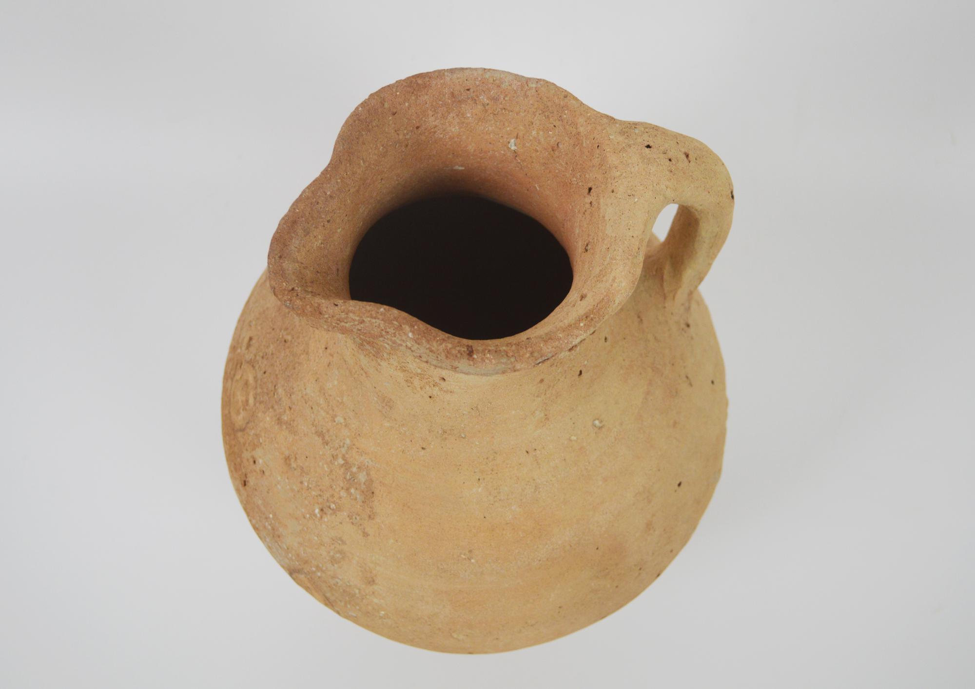 Brocca con orlo ingrossato e piccolo beccuccio, collo cilindrico, corpo globulare, piede ad anello; ansa a nastro impostata dall'orlo alla spalla