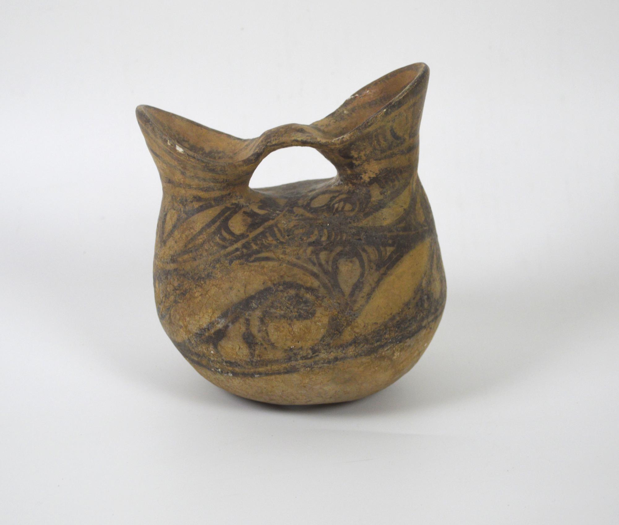 Vaso configurato come un otre stilizzato; nella parte superiore si trovano due bocchelli troncoconici obliqui riuniti da una piccola ansa a nastro; decorato in bruno a motivi geometrici e fitomorfi stilizzati