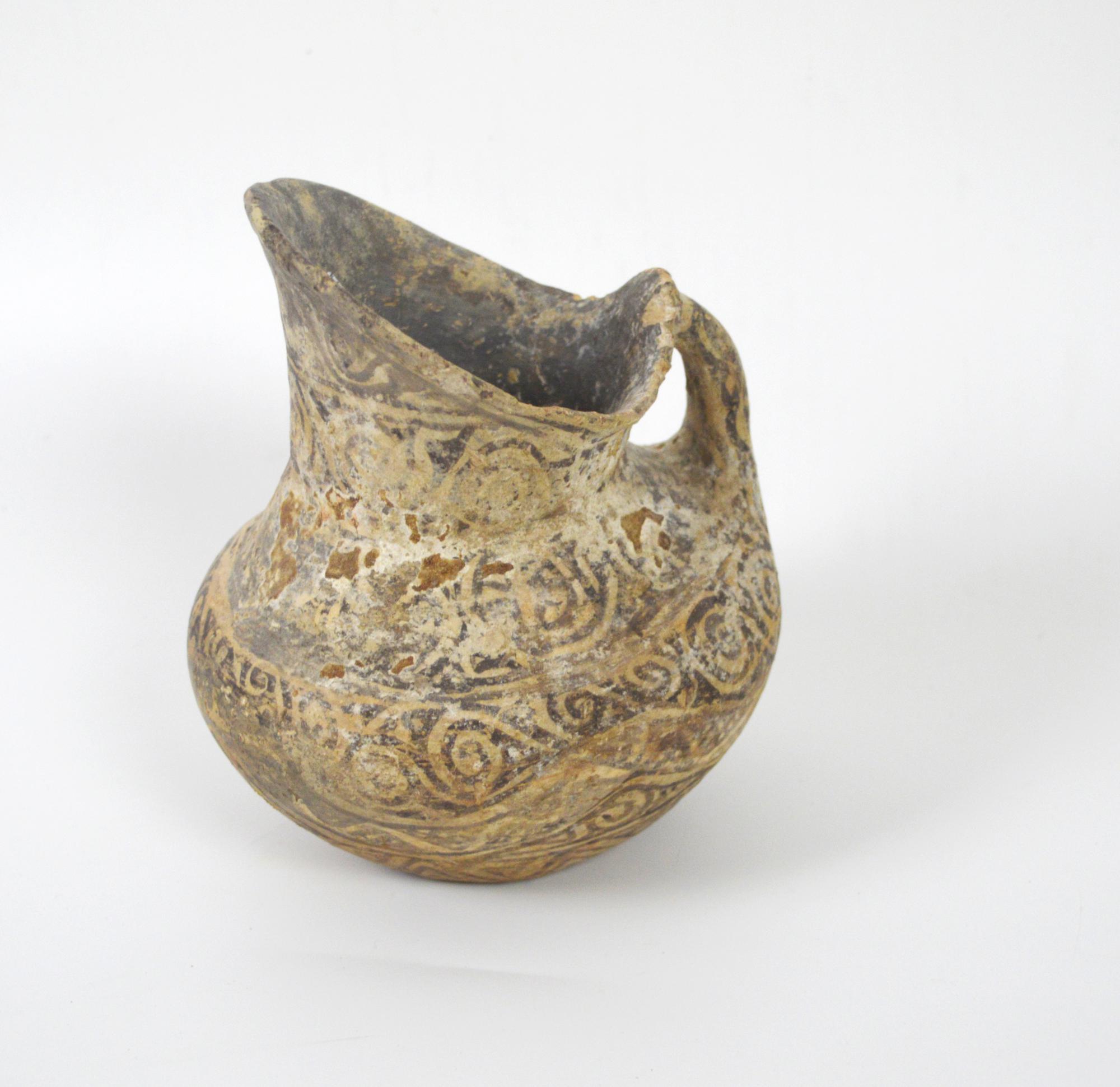 Brocca con becco obliquo, breve collo cilindrico, indistinto dal corpo globulare, fondo piatto, ansa a bastoncello impostata dal labbro alla spalla; decorata in bianco con eleganti girali e motivi fitomorfi.