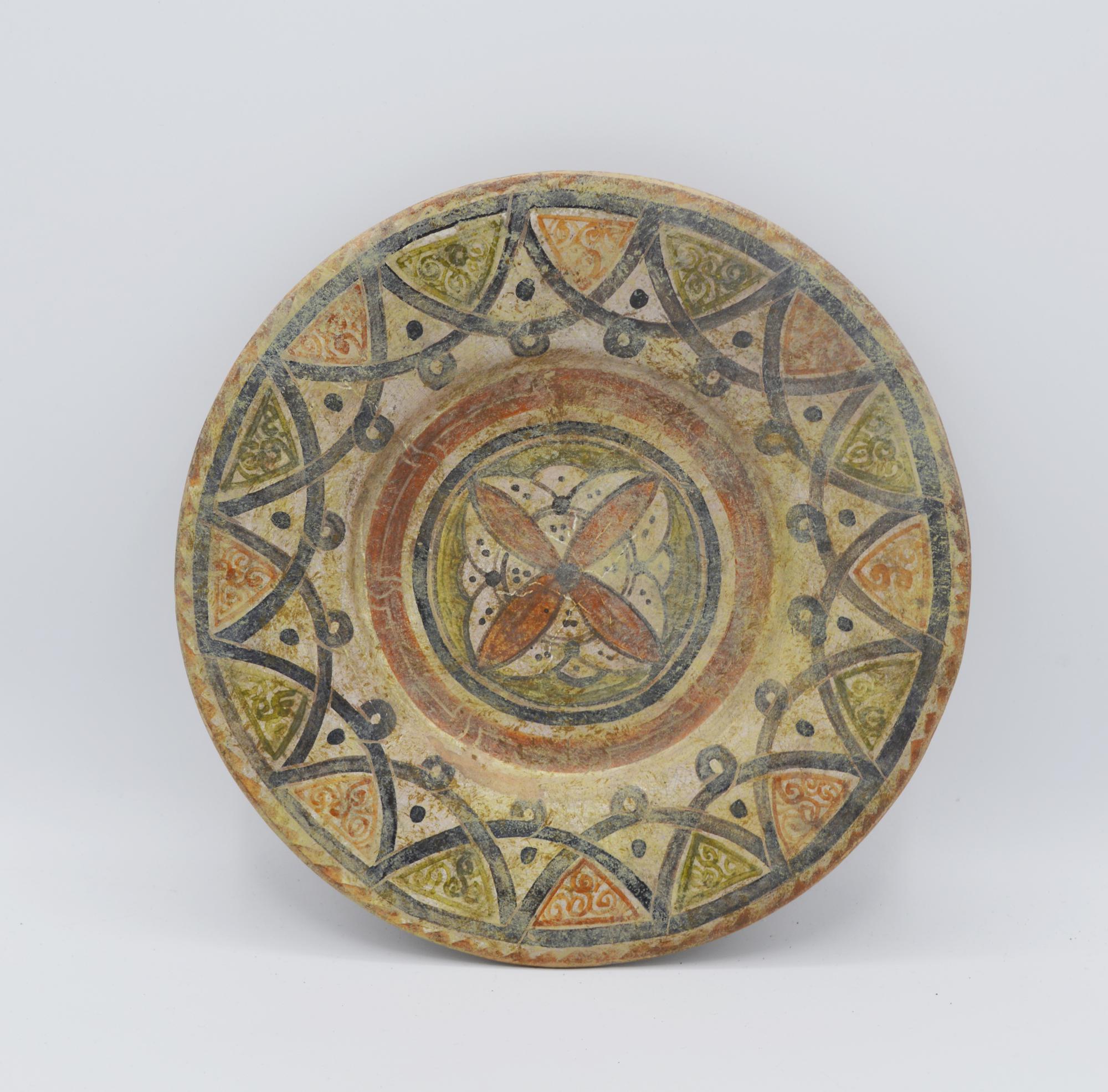 Piatto a larga tesa decorato a motivi geometrici con archi di cerchio e motivi fitomorfi stilizzati.