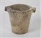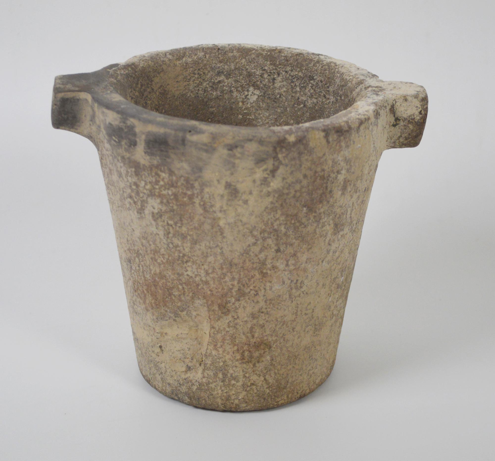 Mortaio troncoconico con due anse a parallelepipedo contrapposte sul bordo appiattito, fondo piatto
