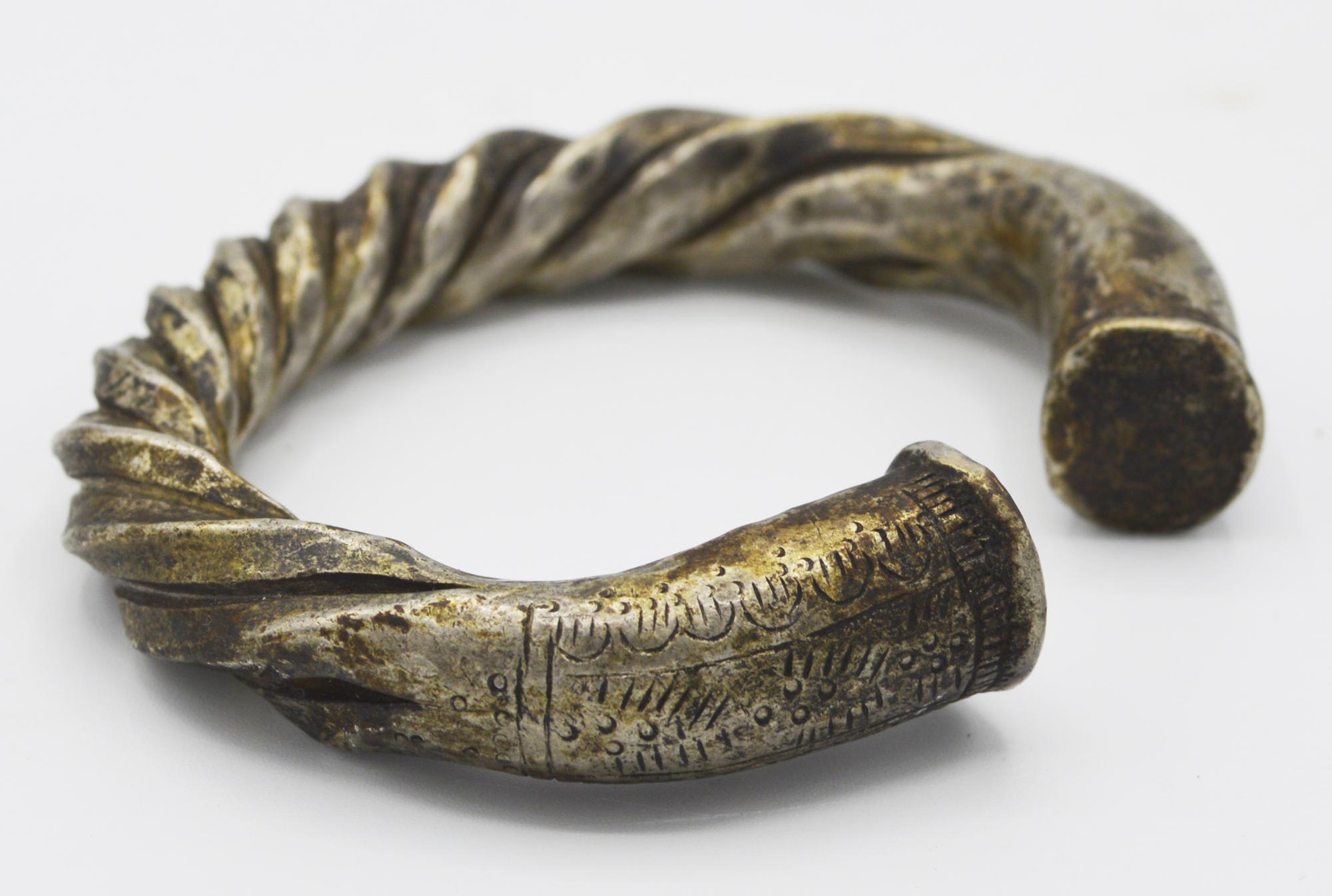 Armilla in verga ritorta spiraliforme nella parte centrale e cilindrica liscia, decorata a punzone in quelle distali.
