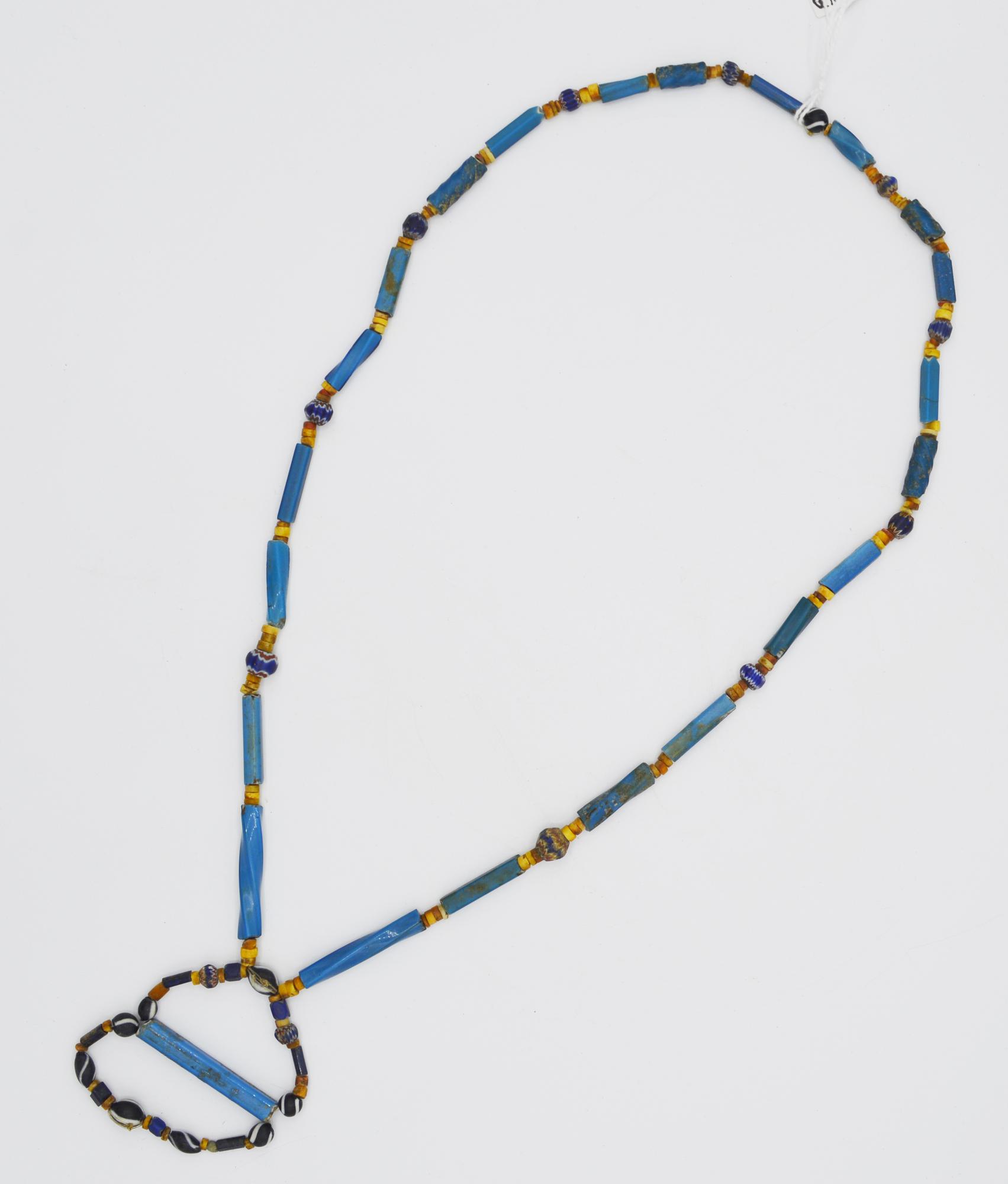 Collana equadoregna formata da vaghi cilindrici in pasta vitrea turchese, bianca, gialla, nera, con alcuni vaghi in vetro mosaico.