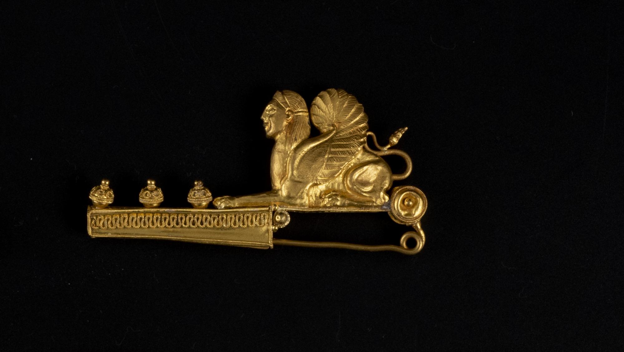 Grande fibula a staffa lunga con arco sormontato da una grande sfinge realisticamente modellata con ali riunite sulla schiena e coda sollevata ad 'S'; staffa decorata a granulazione.