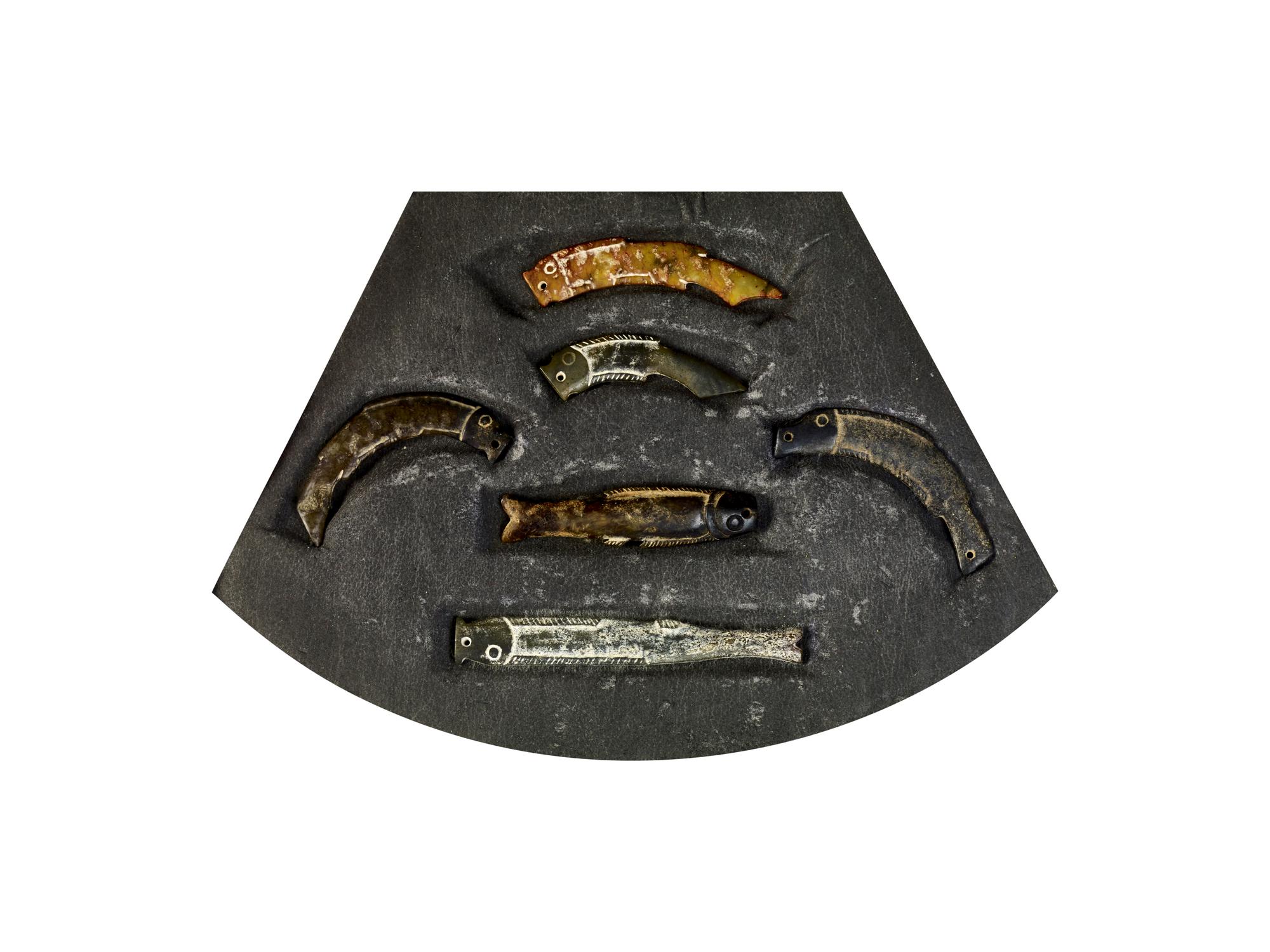 Gruppo di sei pendenti a forma di pesce: quattro sono curvi, due dritti di cui uno, piu` spesso, porta iscrizioni probabilmente di epoca successiva.