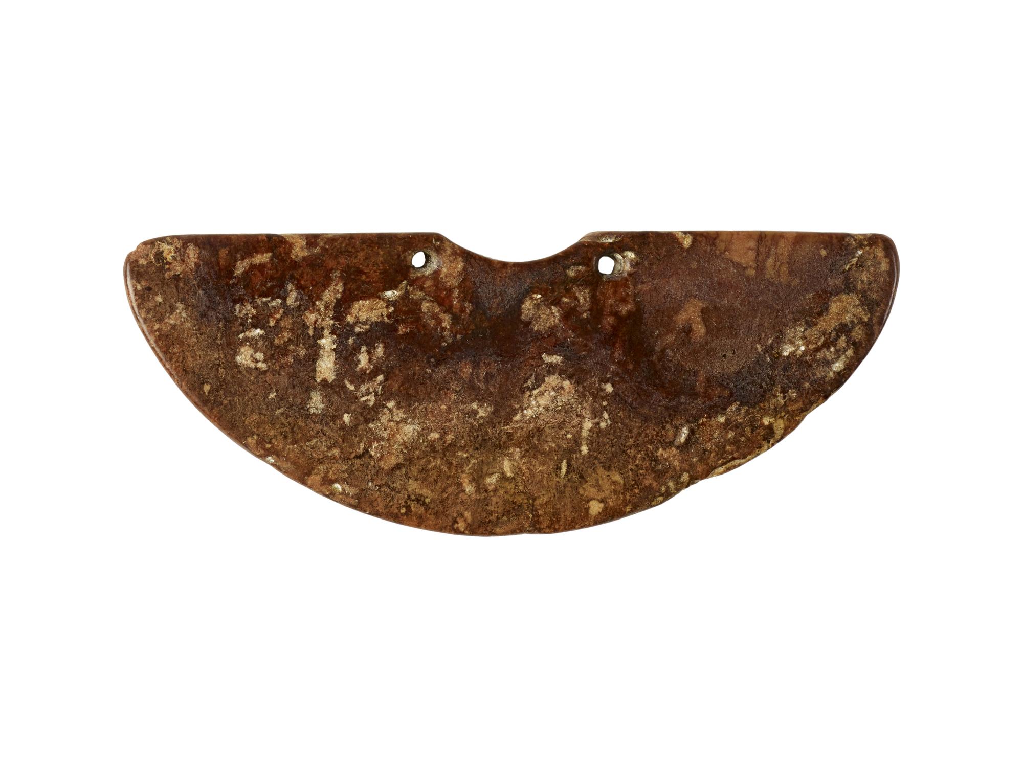 Placca ornamentale di forma semicircolare in nefrite bruna, probabilmente veniva posta sotto il naso nelle maschere funerarie