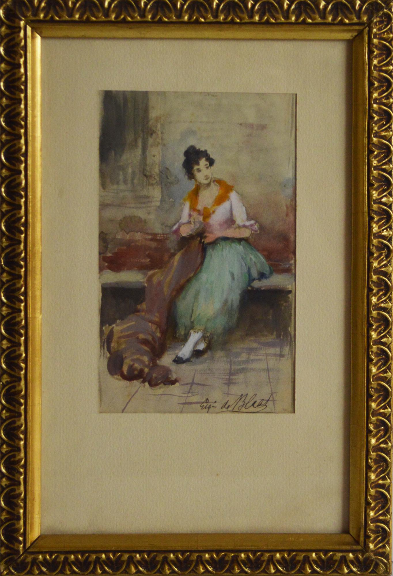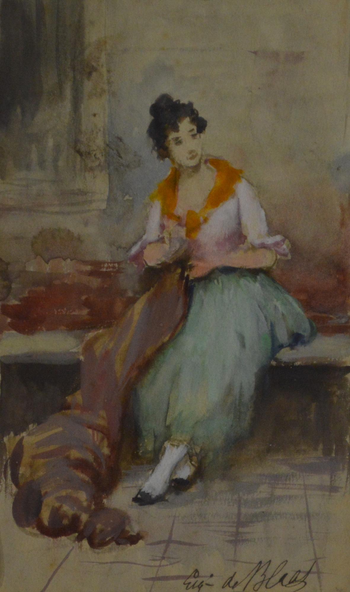 Eugenio De Blaas TESSITRICE acquerello su carta, cm 22x15 firma sul retro:...