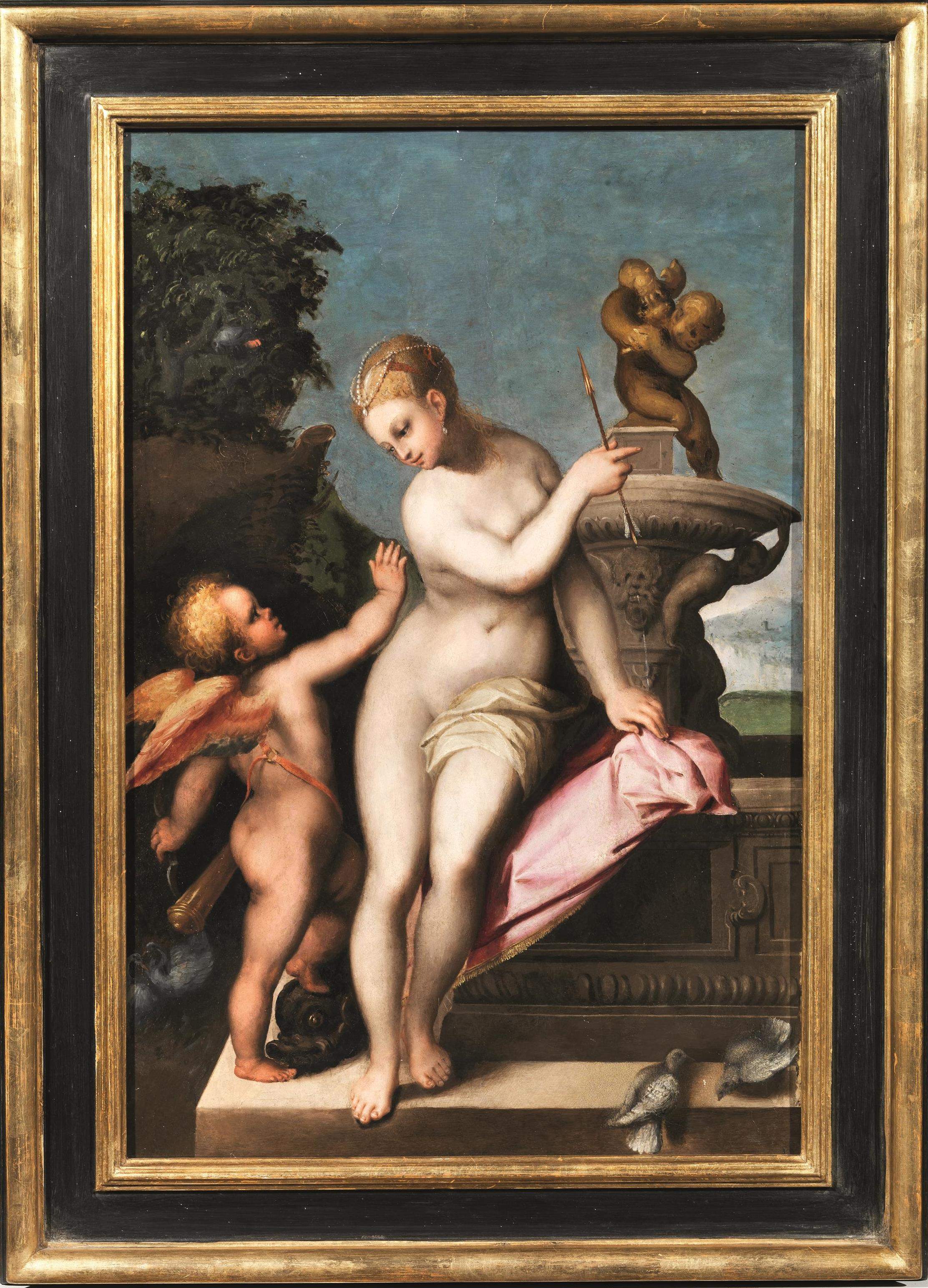 Pittore tardo-manierista, sec. XVIVENERE DISARMA CUPIDOolio su pergamena, cm...