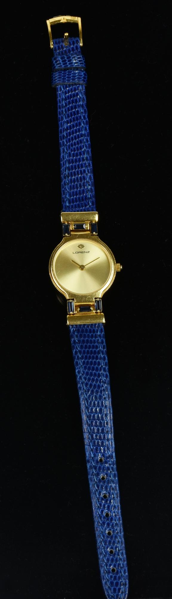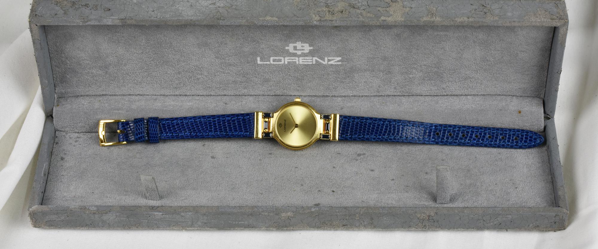 marca Lorenz, cassa in metallo dorato con zaffiri taglio baton, movimento al quarzo, corredato da astuccio originale