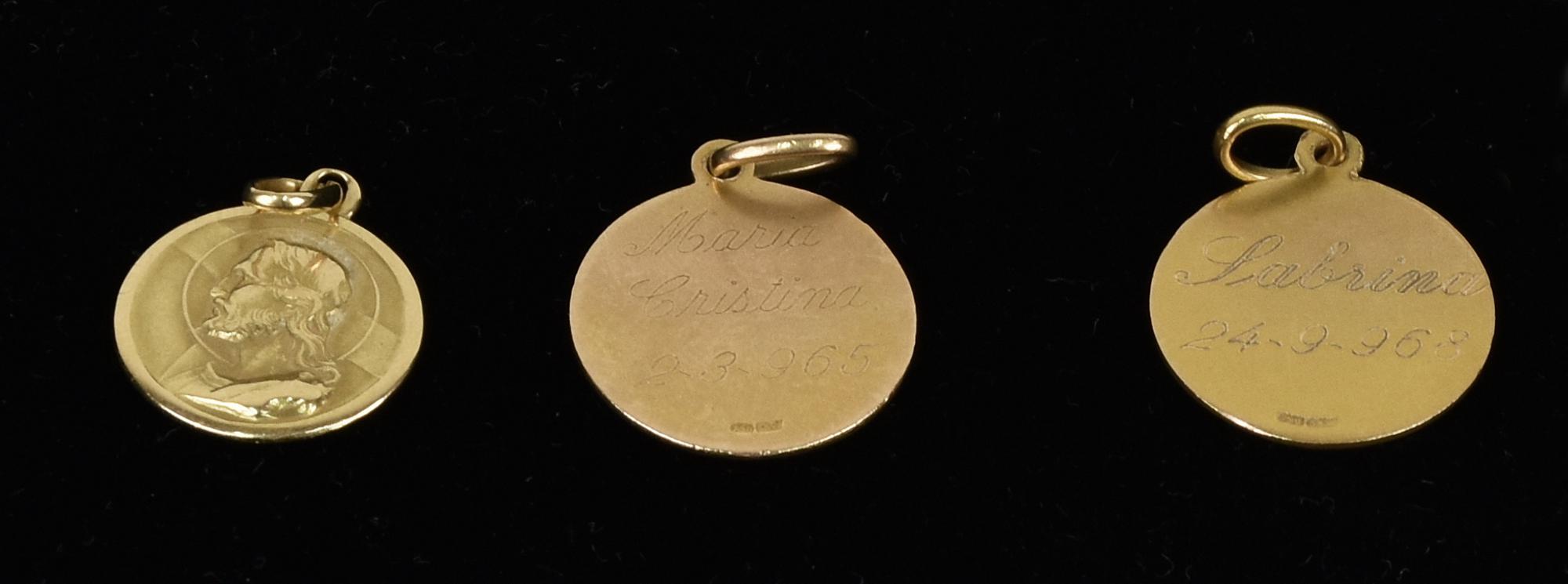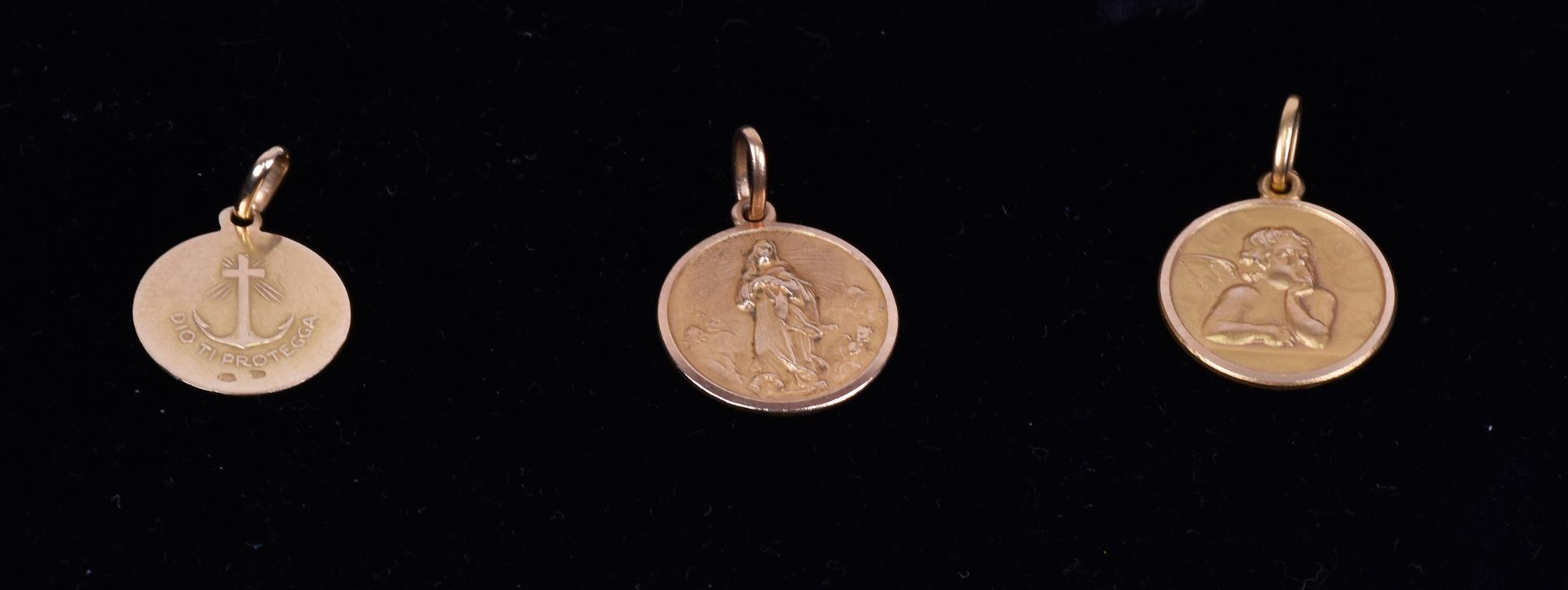 TRE MEDAGLIETTE IN ORO GIALLO raffiguranti la Vergine Maria, Gesu' e un...