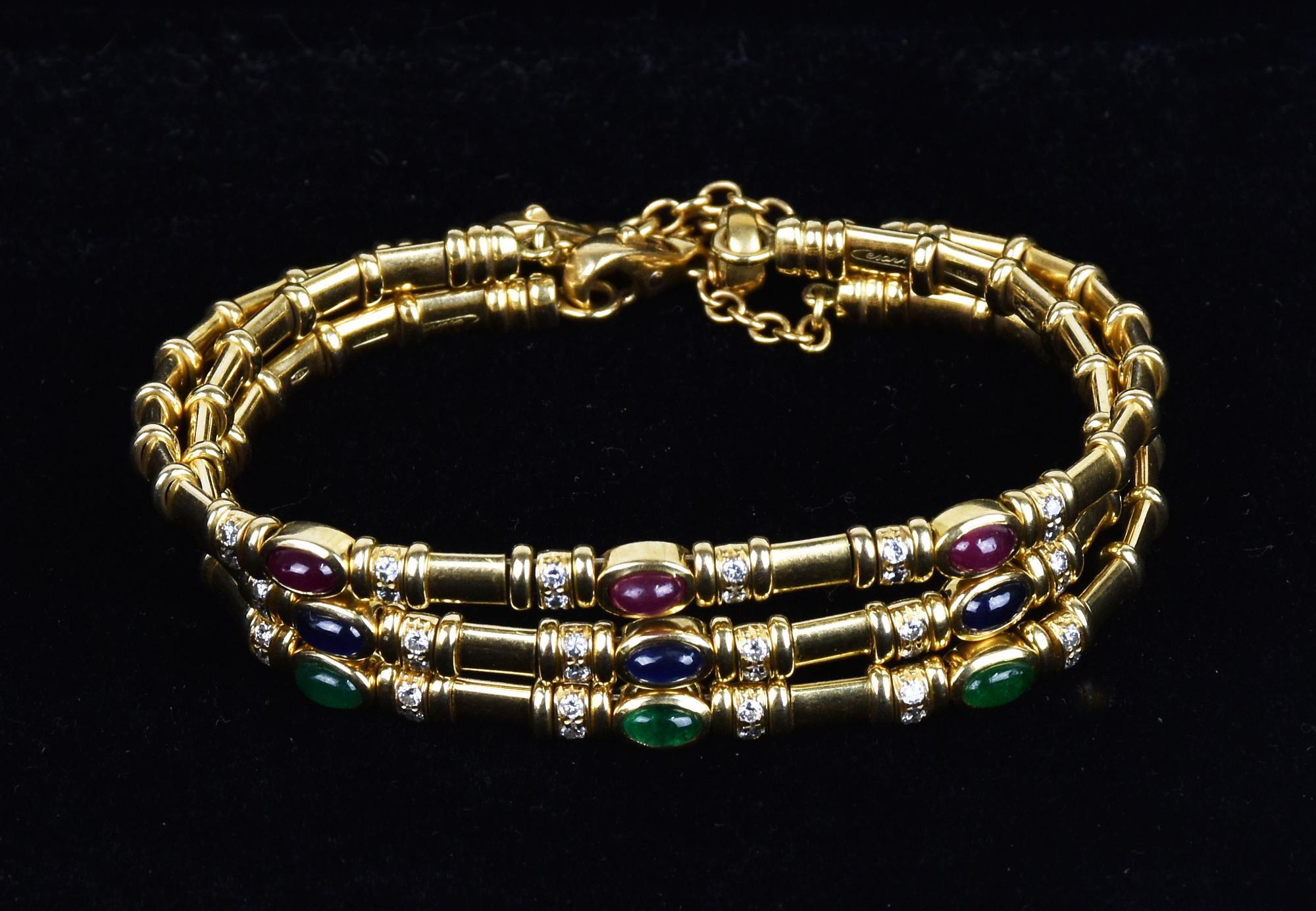 LOTTO DI TRE BRACCIALI IN ORO GIALLO con piccoli corindoni blu e rossi,...