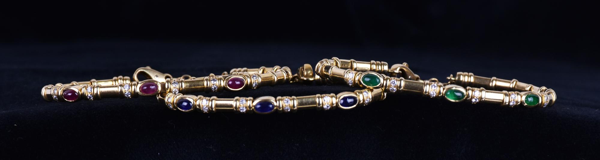con piccoli corindoni blu e rossi, rispettivamente zaffiri e rubini, oltre a berilli verdi varieta' smeraldi; tutti taglio cabochon con piccoli diamanti alternati