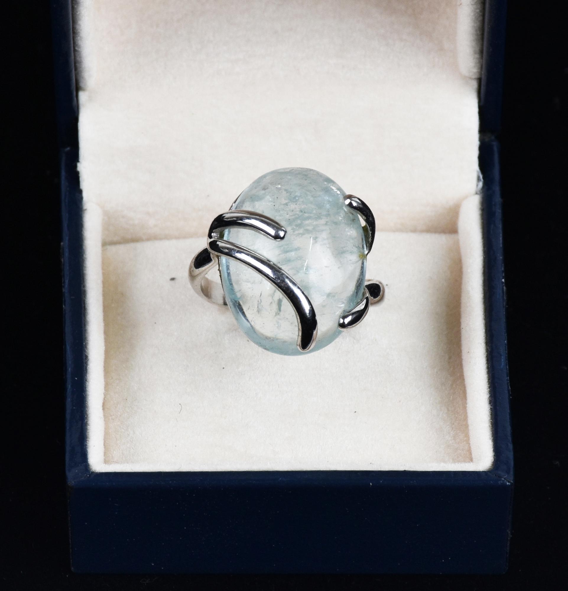 ANELLO IN ORO BIANCO CON BERILLO AZZURRO taglio cabochon mis 15,5 peso g 7,6...