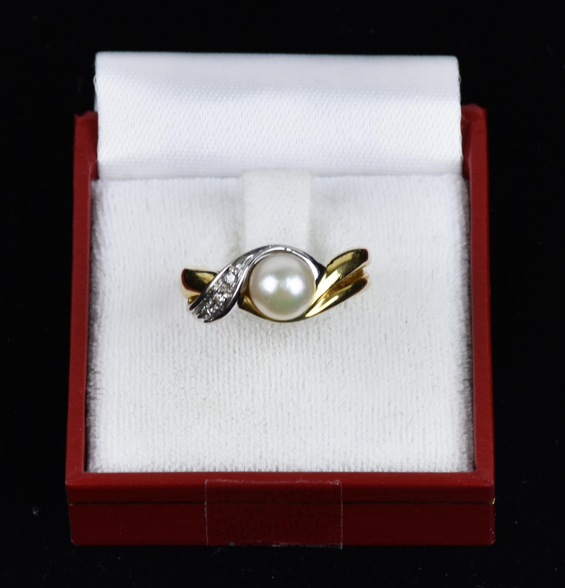 Lotto 49 | ANELLO IN ORO GIALLO E BIANCO con perla coltivata e piccoli brillanti mis 17...