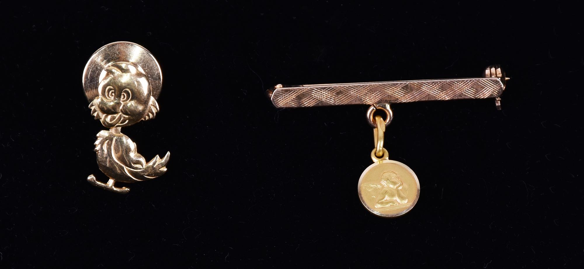 una da bavaglino con pendente raffigurante angelo cherubino e una da giacca raffigurante un papero