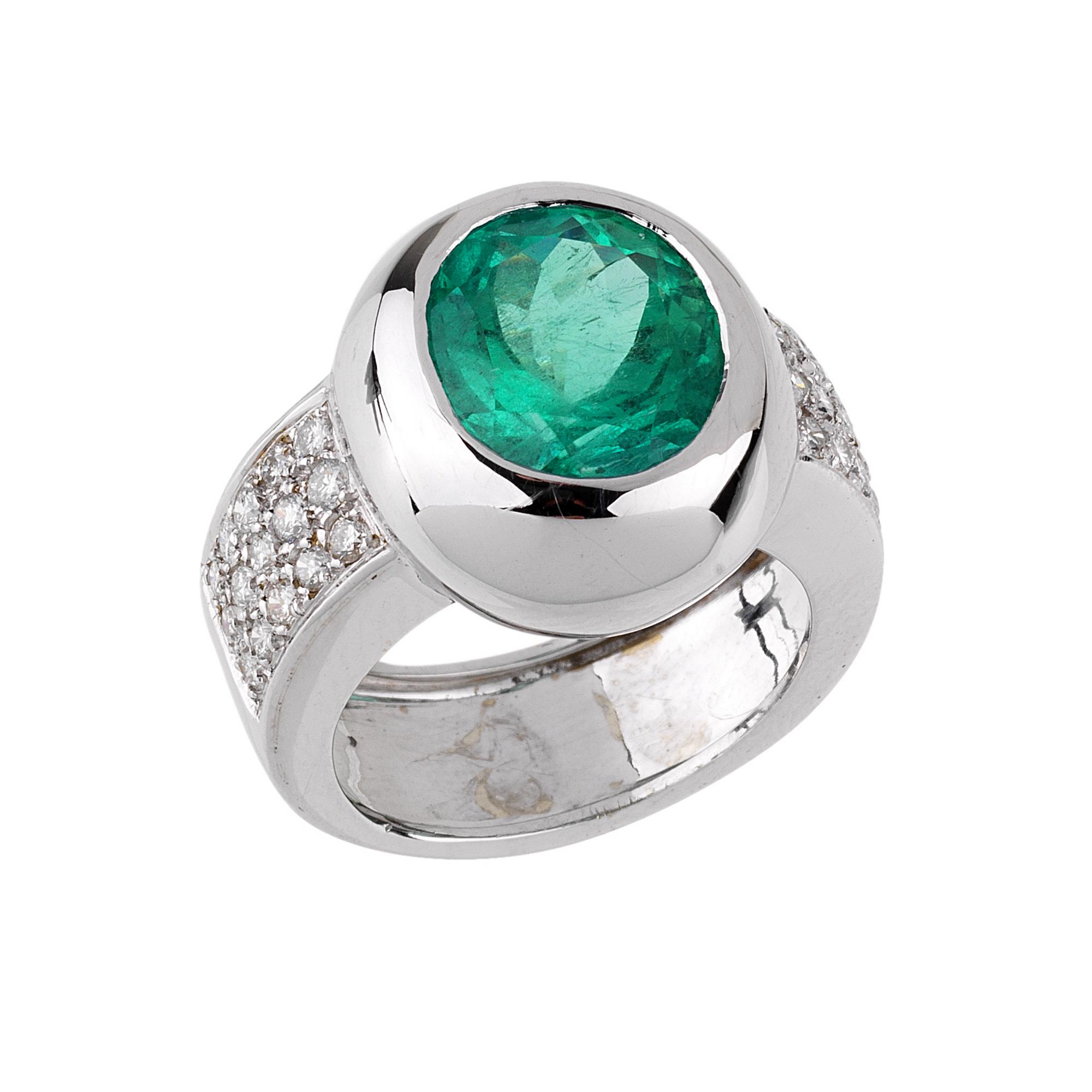 montatura bombata centrata da uno smeraldo ovale di ct 4,5 circa, fascia decorata da un pavé di diamanti per ct 0,60 circa, punzone 750, mis 14, g 14