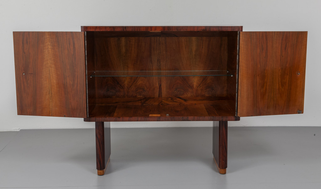 impiallacciati in noce, maniglie di cristallo e ottone, interno impiallacciato in acero con piano in cristallo.