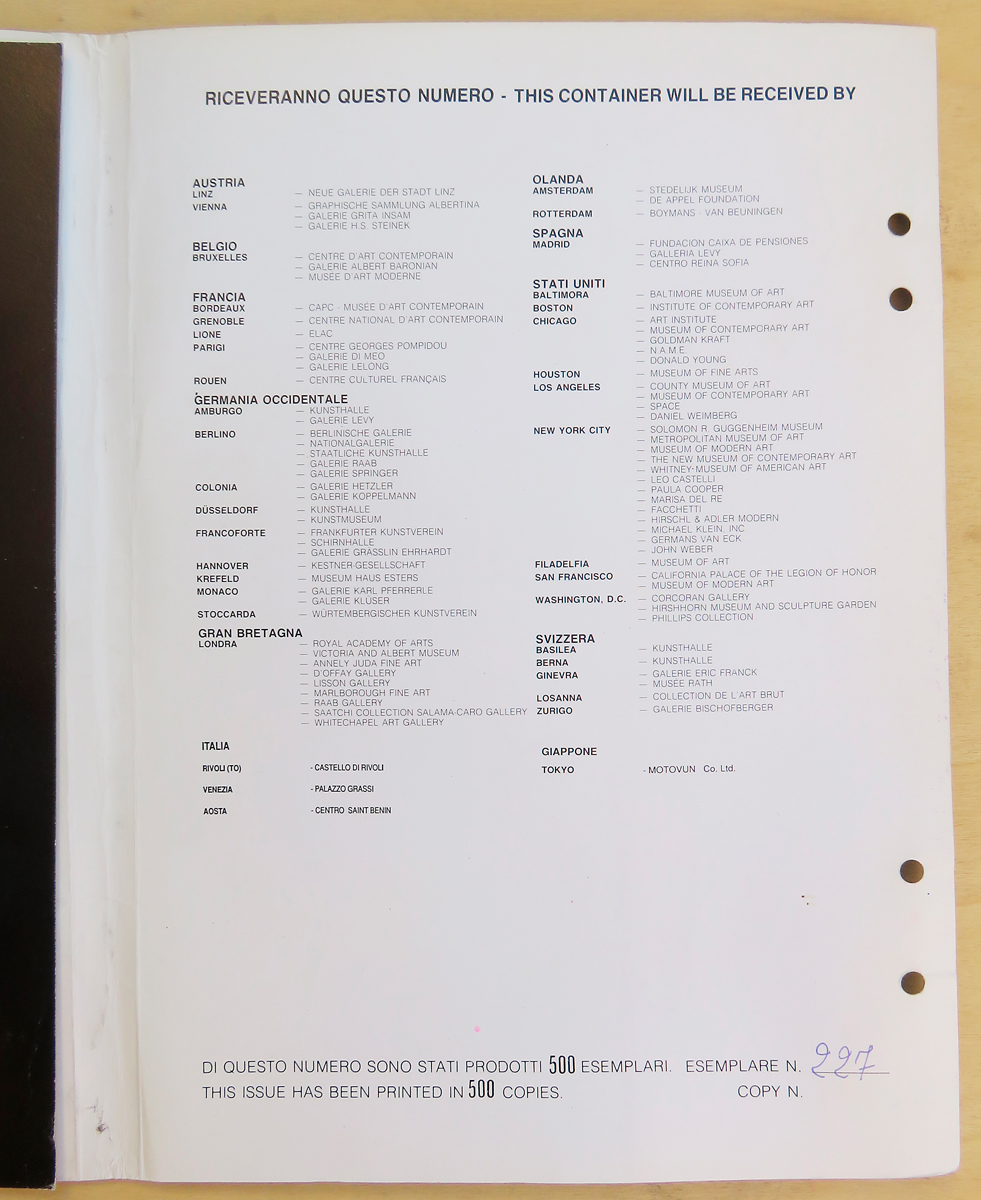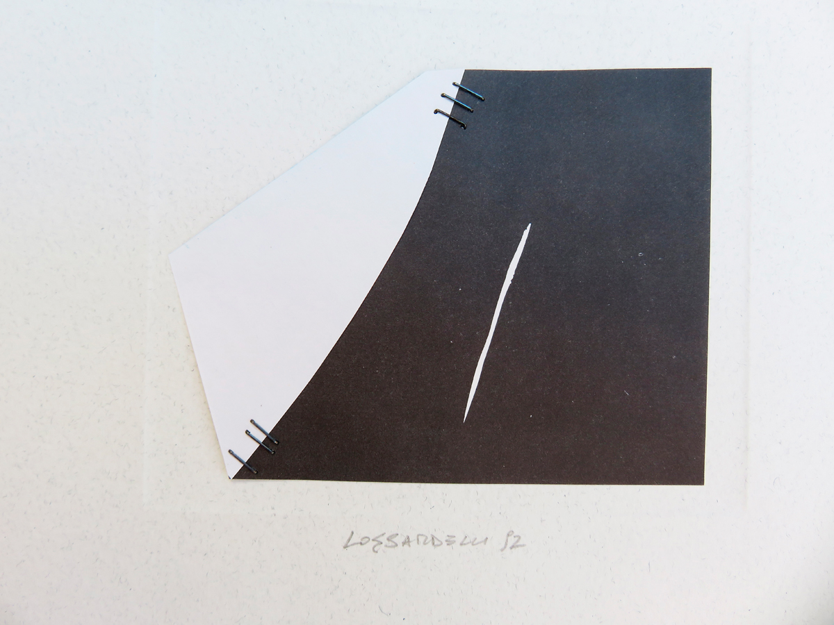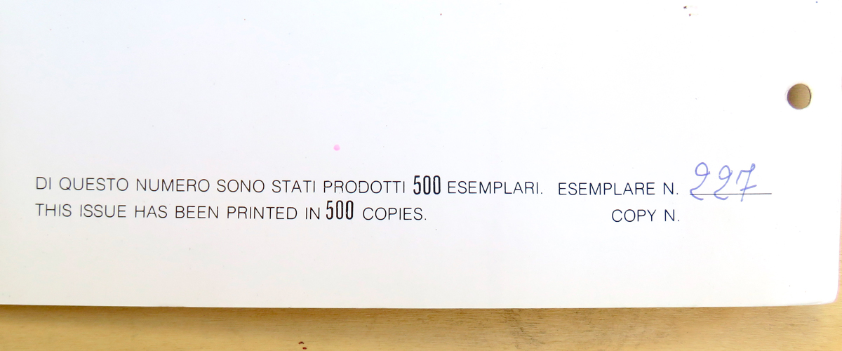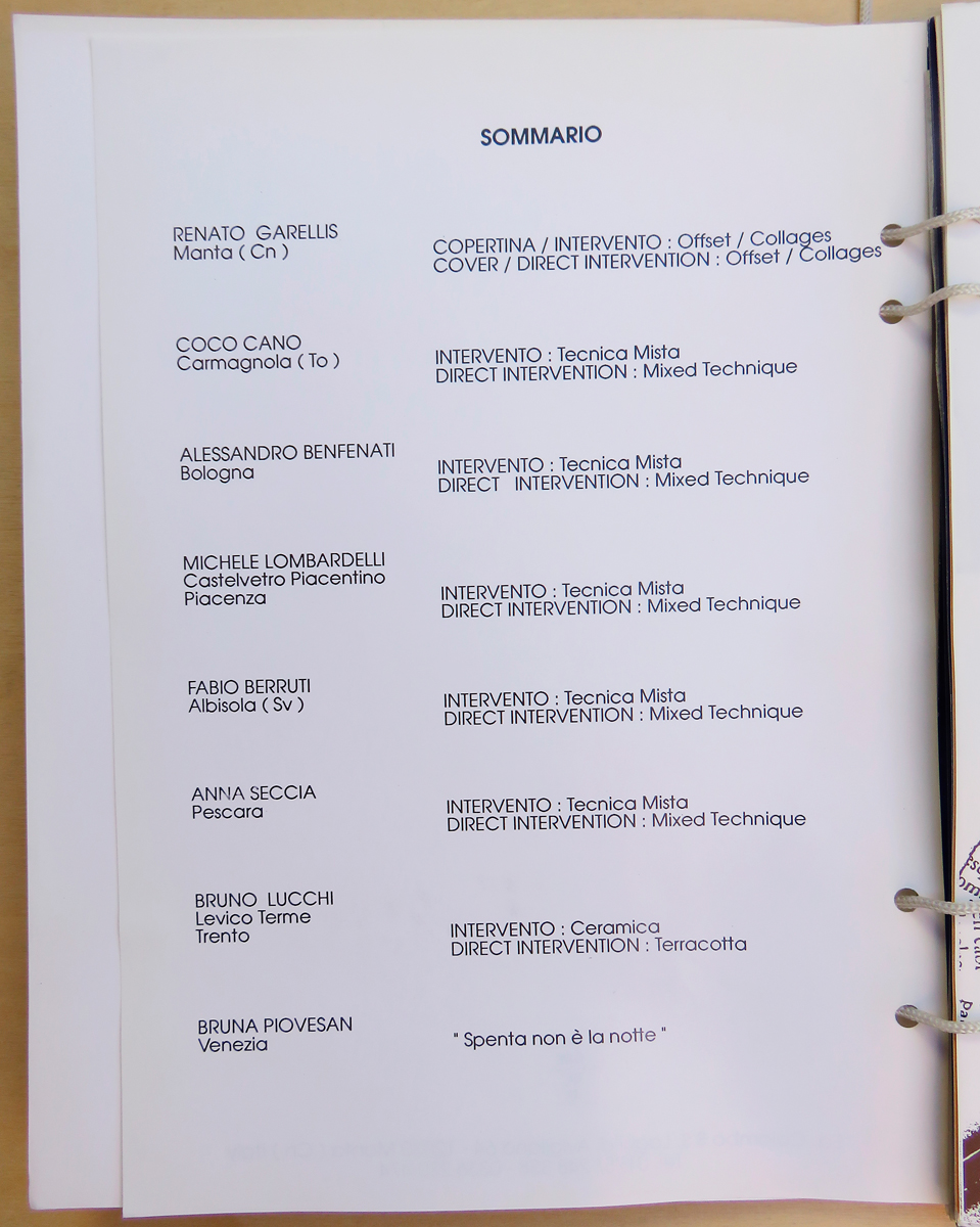 Cartella in cartoncino a 6 facciate, legata e chiusa con cordoncino bianco passante, contenente i seguenti interventi d'artista: Renato Galleris (copertina/offset/collages), Coco Cano (tecnica mista e collage), Alessandro Benfenati (tecnica mista), Michele Lombardelli (tecnica mista), Fabio Berruti (tecnica mista), Anna Seccia (tecnica mista), Bruno Lucchi (ceramica), Bruna Piovesan (poesia “spenta è la notte”). Libro d'artista colettivo in 500 esemplari, numero 227