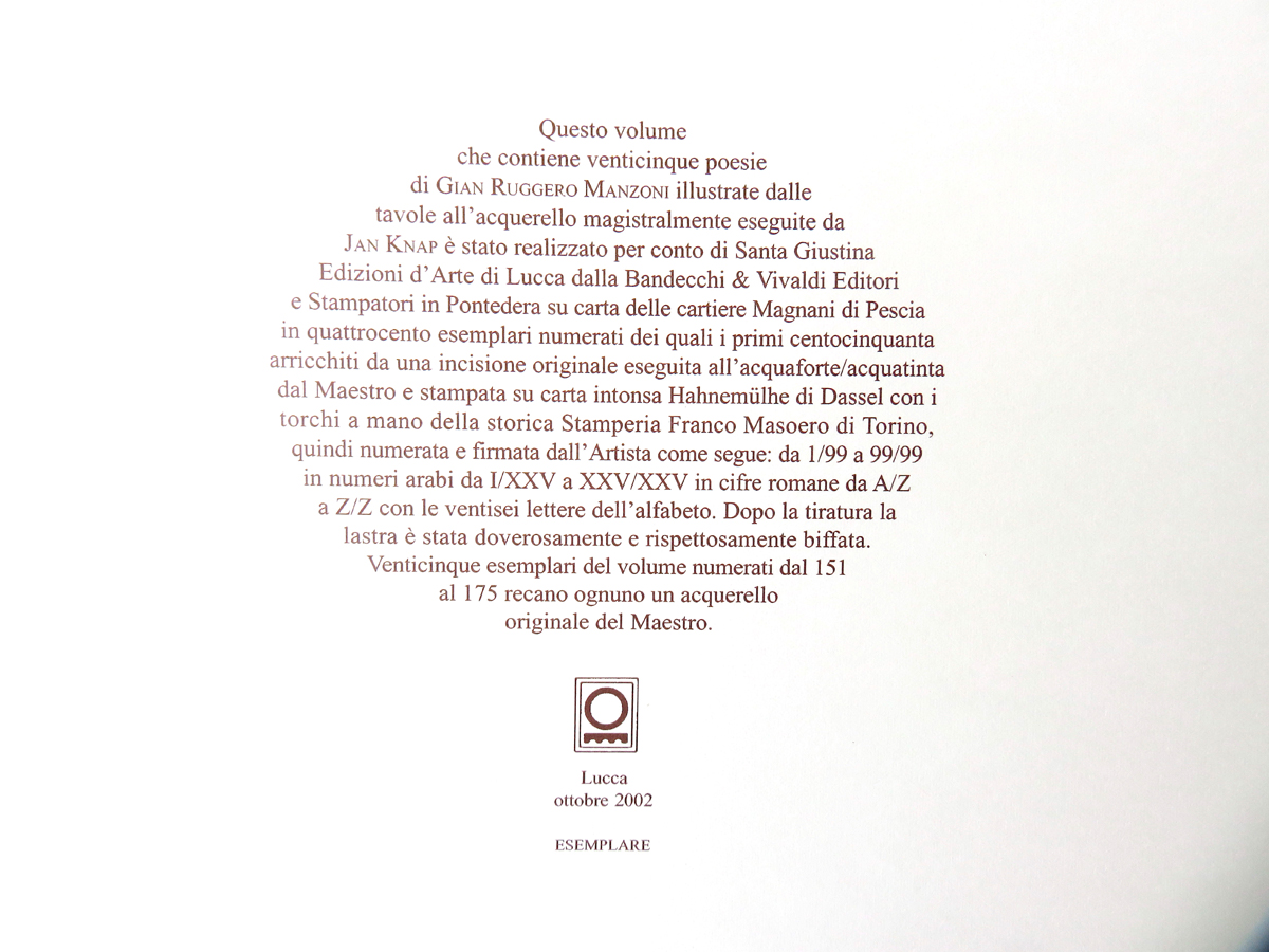 Catalogo che contiene 25 poesie di Gian Ruggero Manzoni illustrate da 25 tavole all'acquerello eseguite da Jan Knap, realizzato per conto di Santa Giustina Edizioni d'Arte di Lucca da Bandecchi & Vivaldi Editori e Stampatori in Pontedera. Esemplare non numerato