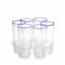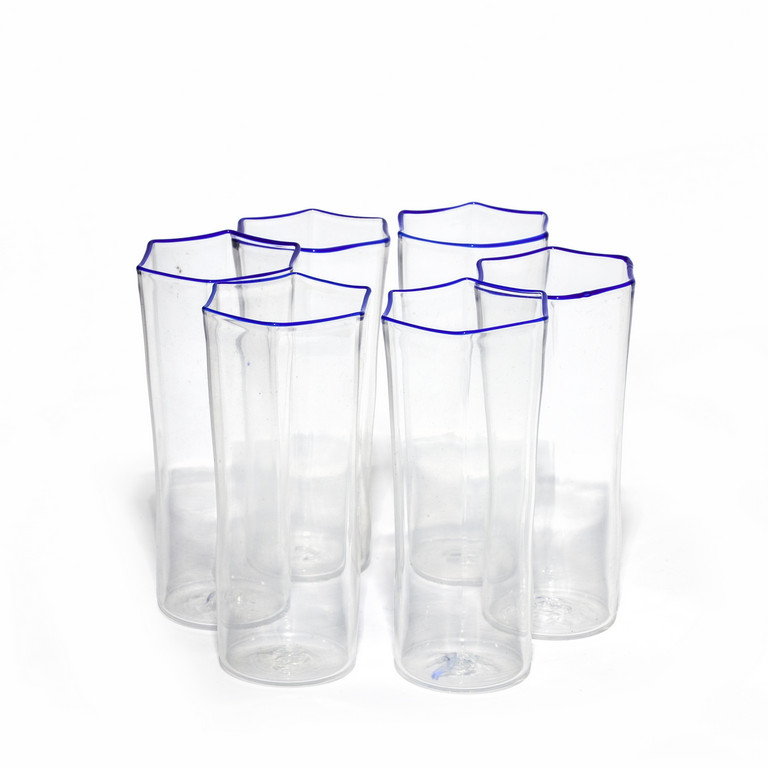 Un gruppo di sei bicchieri esagonali in vetro trasparente con bordo azzurro circa 1925.