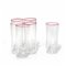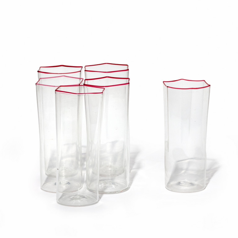 Un gruppo di sei bicchieri esagonali in vetro trasparente con bordo rubino circa 1925.