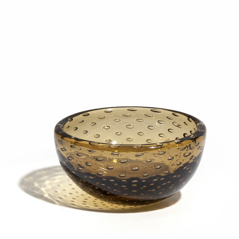 Una coppa rotonda in vetro trasparente ambra a bolle regolari circa 1940.