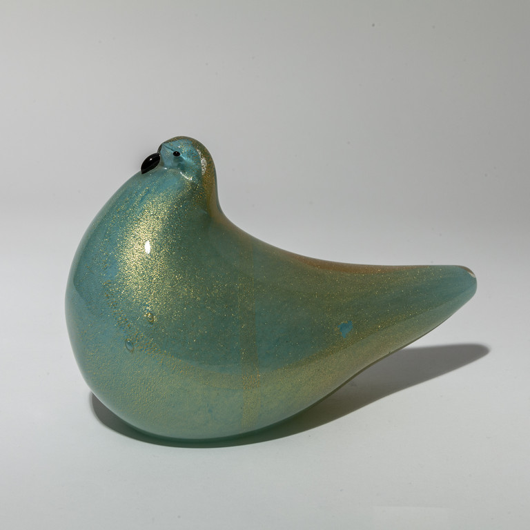 Figura di piccione in vetro opalino azzurro a graniglia e foglia oro anni '70.