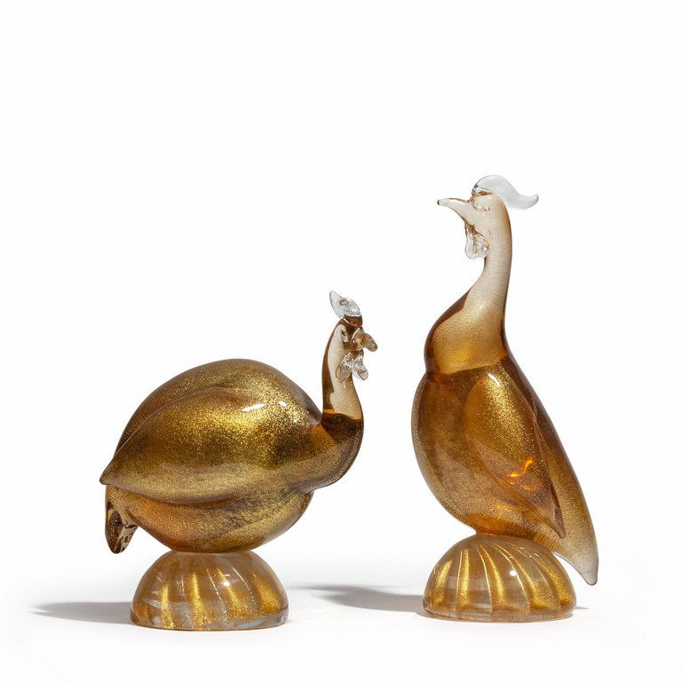 Una coppia di galline faraone in vetro trasparente e foglia oro circa 1950.