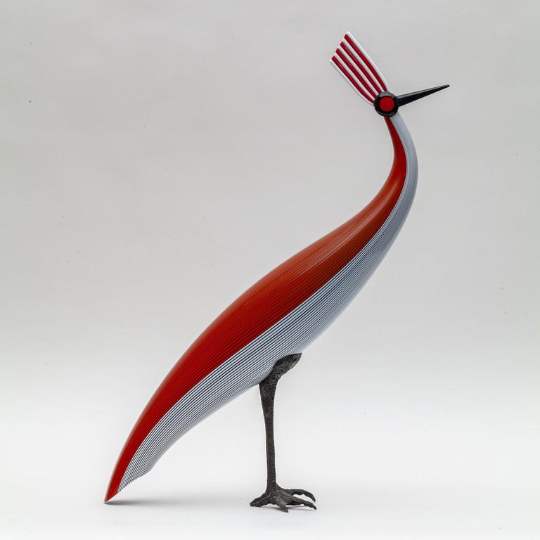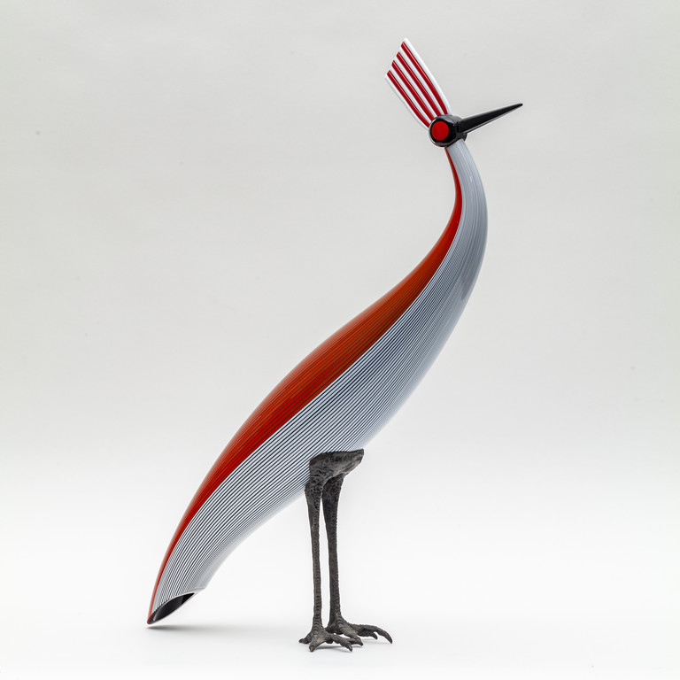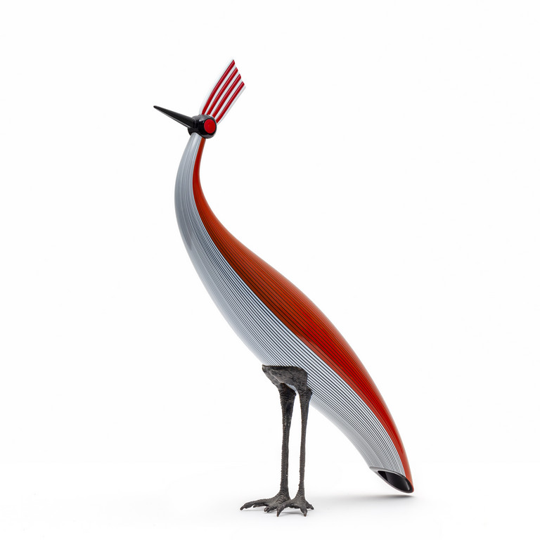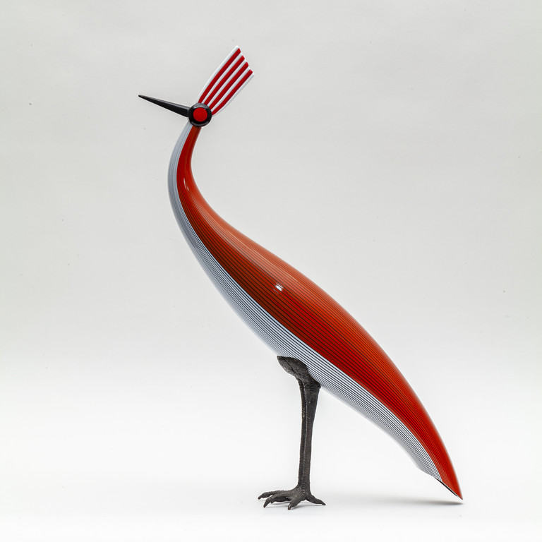 Una figura di 'airone maschio' di vetro in filigrana colorata su fondo nero zampe in bronzo 1984.