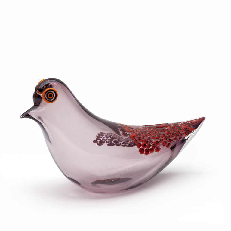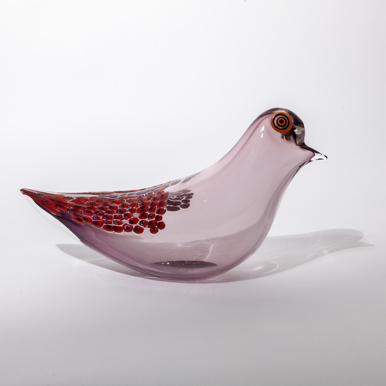 Figura di uccello in vetro trasparente con applicazione di murrine su occhi e ali circa 1970.