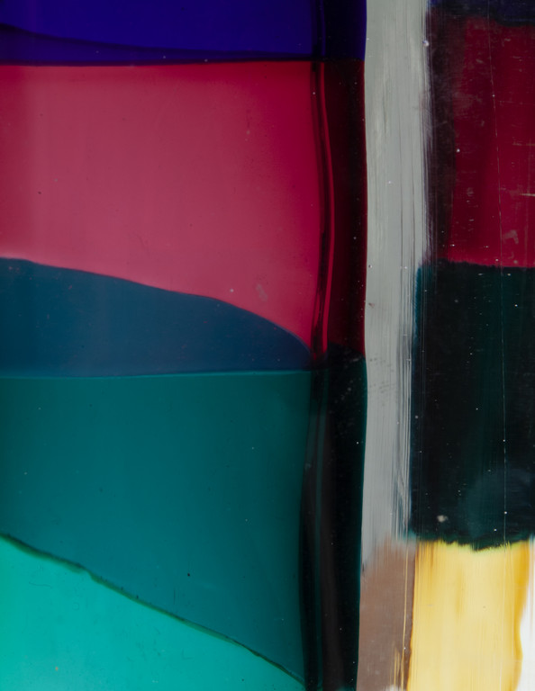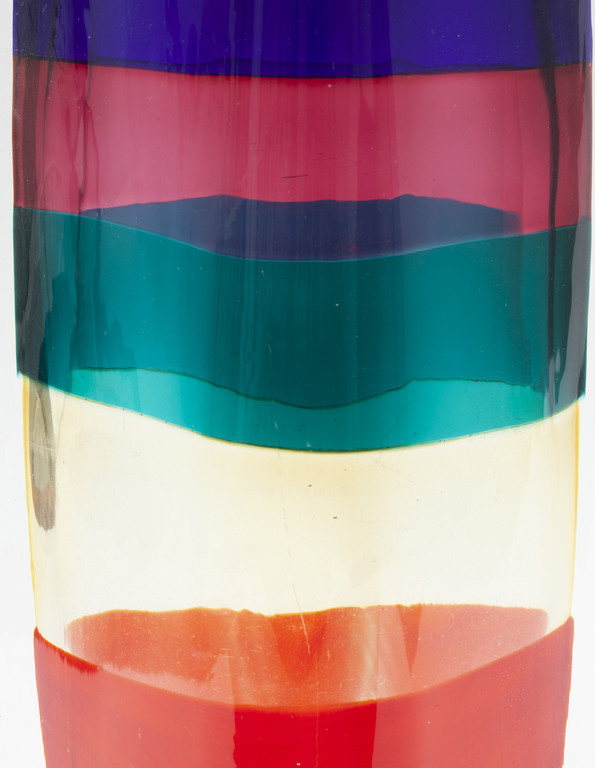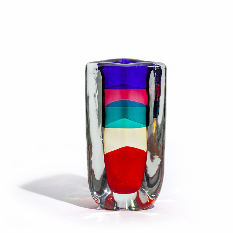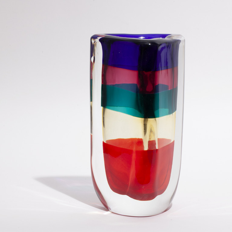 Un vaso a 'fasce sommerse' a sezione triangolare in vetro massiccio incolore e fasce orizzontali di vari colori 1993.
