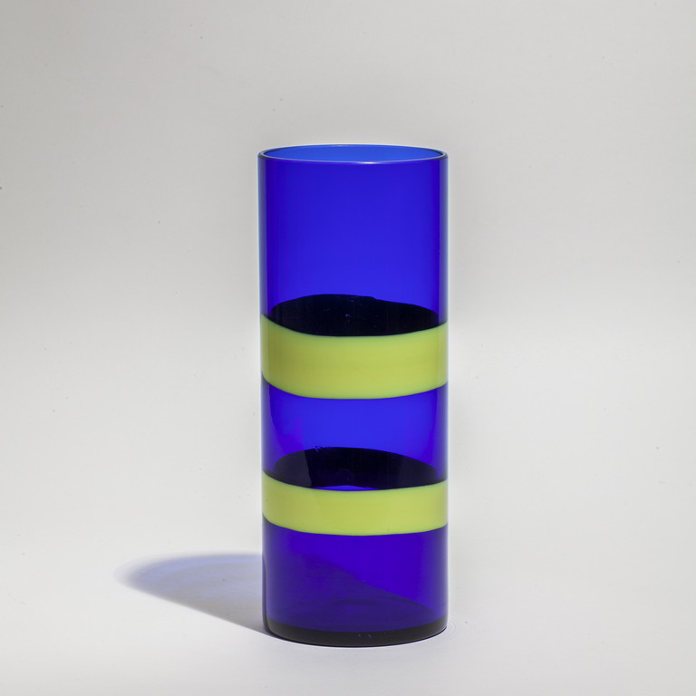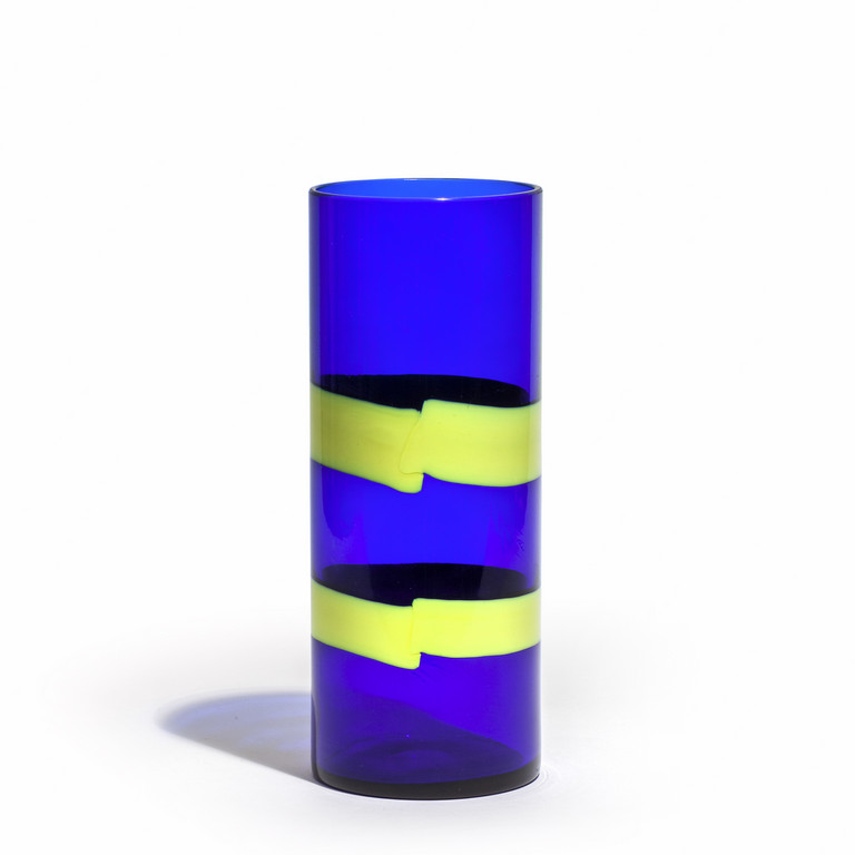 Un vaso cilindrico in vetro trasparente zaffiro decorato da due fasce orizzontali in giallo opaco modello '7169' 1960.