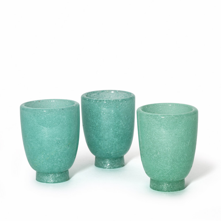 Tre bicchieri in vetro 'a bollicine' verde giada 1932.