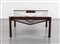 Jacaranda wood with veneered inclined magazine shelves in rosewood sliding glass shelves.