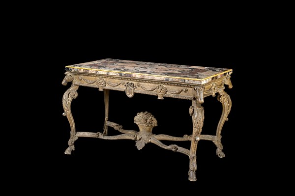 Tavolo da parete in legno laccato e intagliato, fascia a motivo concatenato decorata a cesti fioriti e centrata da medaglione con profilo virile. Gambe scolpite all'attacco a testa di cavallo e motivi floreali, riunite da traverse mosse centrate da cesto con frutti. Piedi a zoccolo. Piano lastronato in marmi vari profilato in giallo Siena (cm 158x94,5x78) Secolo XVIII (difetti)