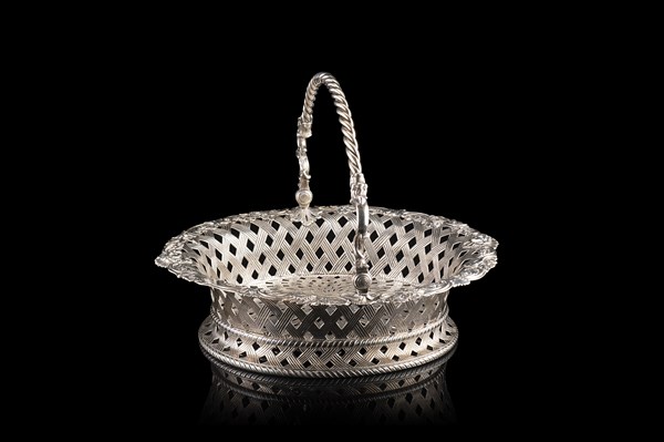 Cestino ovale da pane in argento con presa a torciglione cesellata all'attacco a mascheroni. Corpo traforato e cesellato a finto vimini e decorato nel bordo a volti femminili e volute fiorite. Argentiere Elizabeth Godfrey, Londra, 1748 (cm 38x32x30) (g 2400)