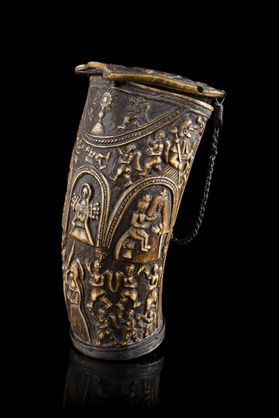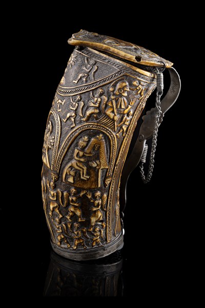 Curioso oggetto con grande probabilità contentitore per cariche o palle da arma da fuoco, realizzato in corno bovino intagliato con scene religiose e angeli. Al retro raffigurazione della Crocifissione. Coperchio amovibile unito da catenella recante figure di angeli e di caprone. Manico e ghiera in argento cesellato con mascherone centrale. Fondello con raffigurazione della Madonna assisa. Produzione romana, inizio secolo XVII (h. cm 14) (lievi difetti)