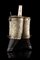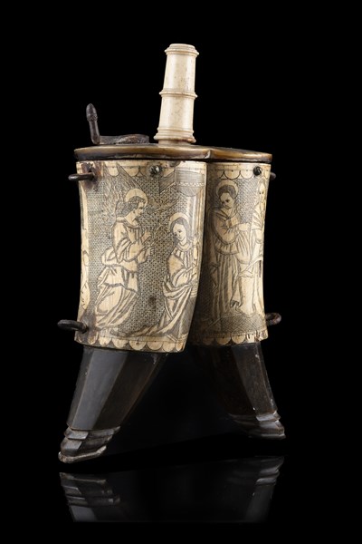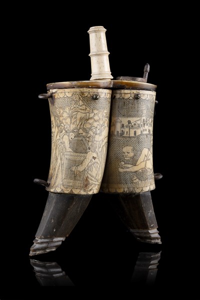 Porta polvere costituito da due corna bovine unite tra loro. Parte inferiore squadrettata e zona centrale rivestita in osso bianco decorato da raffinate incisioni di carattere religioso. Coperchio recante inscrizioni e lo stemma della Casa Reale d'Austria con Gran Collare dell'Ordine del Toson d'Oro. Ganci di sospensione in ferro e beccuccio tornito in avorio. Austria, secolo XVIII (h. cm 21) (lievi difetti)