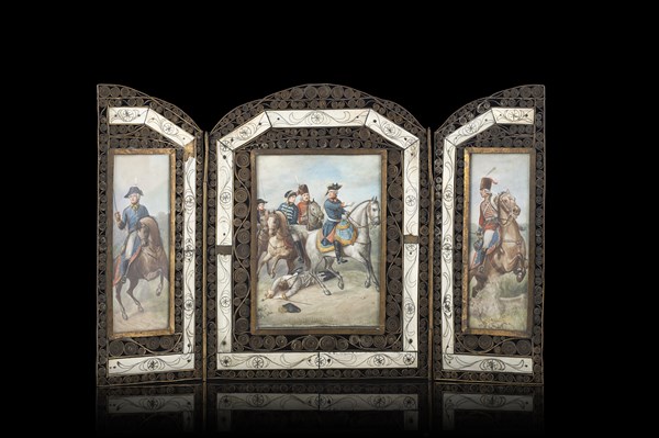 Trittico in metallo argentato nella parte pittorica centrale Federico il Grande contornato dal suo stato maggiore. Nelle due parti laterali un ussaro della guardia ed un aiutante di campo dallaltra. Bordure in osso inciso. Nella parte anteriore montati su velluto sono presenti in metallo dorato due stemmi nobiliari che portano come cimasa elmi con corone principesche e cimieri uno con un unicorno e l'altro con leone rampante. Nella parte posteriore una corona reale con al centro due stemmi come spesso si vedono presenti in doni nuziali. Uno dei due stemmi è attribuibile alla casa dei Borboni.