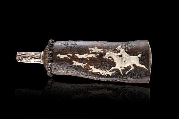 Polverino per polvere da sparo, corpo in corno di cervo decorato ad intarsio a rilievo in avorio con scena di caccia alla volpe, nel fondello cane da caccia che afferra una lepre. Oggetto non d'uso, ma tipico regalo ad un cacciatore. Probabilmente Inghilterra, secolo XIX (h. cm 17) (lievi difetti e segni del tempo)