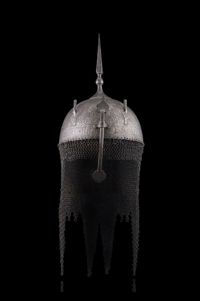 Kulan-kud in ferro, puntale aguzzo rivettato, coppo emisferico decorato a motivi vegetali e floreali, sulla fascia versetto coranico, sotto la patina si intravedono agemine in oro. Doppia pennacchiera e nasale mobile, mancante della vite di fissaggio. Camaglio a otto punte. Persia, fine secolo XVIII (h. totale cm 57) (lievi difetti)