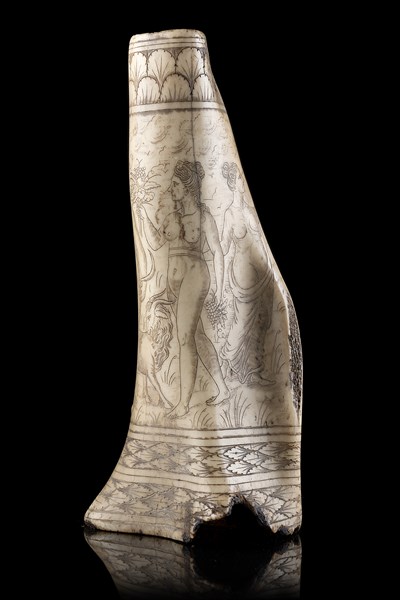 Corpo di porta polvere realizzato in osso, mancante del fondello e del beccuccio. Osso interamente inciso con bordure di foglie d'acanto e scena neoclassica con Bacco e baccanti ignudi entro paesaggio. Germania del sud, probabile Scuola di Monaco di Baviera, inizio secolo XIX (h. cm 20) (difetti)