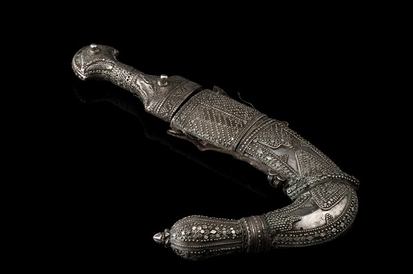 Grande jambiya arabo yemenita con impugnatura in legno rivestita di lamina d'argento con decori geometrici in rilievo. Larga lama a lingua di bue a doppio taglio con costolatura centrale. Fodero in legno ricoperto di lamina d'argento completamente lavorata in rilievo a simboli geometrici. Fine secolo XIX/ inizio secolo XX (l. cm 38) (usura del tempo)