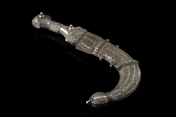 Jambiya arabo yemenita con impugnatura in legno rivestita di lamina d'argento con decori geometrici in rilievo. Larga lama a lingua di bue a doppio taglio con costolatura centrale. Fodero in legno ricoperto di lamina d'argento completamente lavorata in rilievo a simboli geometrici. Fine secolo XIX/ inizio secolo XX (l. cm 33) (usura del tempo)