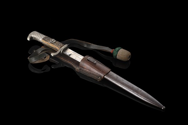 Daga da parata da sottoufficiale della Gendarmeria dell'esercito tedesco, datata 1942. Impugnatura in metallo terminante a testa d'aquila a tutto tondo, guancette in corno di cervo e guardia cesellata a foglie di quercia. Forte lama d'ordinanza ad un filo e mezzo, fodero in ferro. Completa dell'attacco in cuoio per la cintura, unitamente a rarissima dragonna d'ordinanza in pelle verde (l. cm 40)