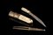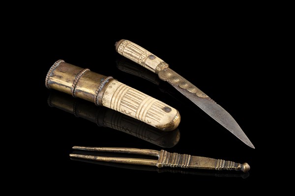 An half 19th century Ceylon Island hunting supply containing "Piha-kaetta" knife with ivory handle and large gilt bronze fork (l. cm 26)