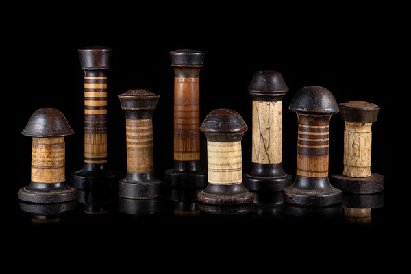 Collezione di otto contenitori, probabilmente porta unguenti, polveri o spezie, con struttura centrale in osso o bambù e basi e coperchi in legno. Sumatra, fine secolo XIX/ inizio secolo XX (h. minima cm 10,5; h. max cm 17,5) (difetti)
