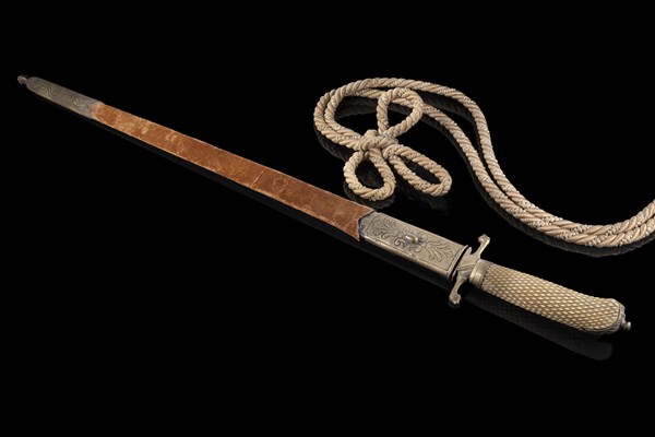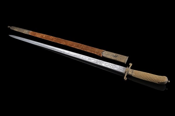 Spada/paloscio da caccia con impugnatura in osso quadrellato e guardia ad "S". Lama ad un filo e un quarto di probabile produzione di Solingen, riccamente incisa a motivi geometrici e scene di caccia. Fodero rivestito in velluto con innesto e puntale in bronzo dorato. Produzione europea, prima metà del secolo XIX (l. cm 66) (difetti all'impugnatura e al fodero)