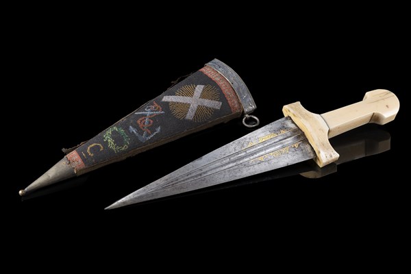 Pugnale coloniale composito, realizzato utilizzando una lama di un katar indiano a lingua di bue, doppio taglio e doppio scorrimento, con agemine in oro e con riportante la data del 1824. Guardia ed impugnatura in avorio massiccio. Fodero coevo, arricchito da lamina di argento sbalzata ad animali fantastici, e rivestimento in micro perline a raffigurare "Ancora ammiragliato", sirto di alloro e la lettera "C". Probabile appartenenza ad un ufficiale inglese di stanza in India. India, 1824 (l. cm 42) (difetti al fodero)